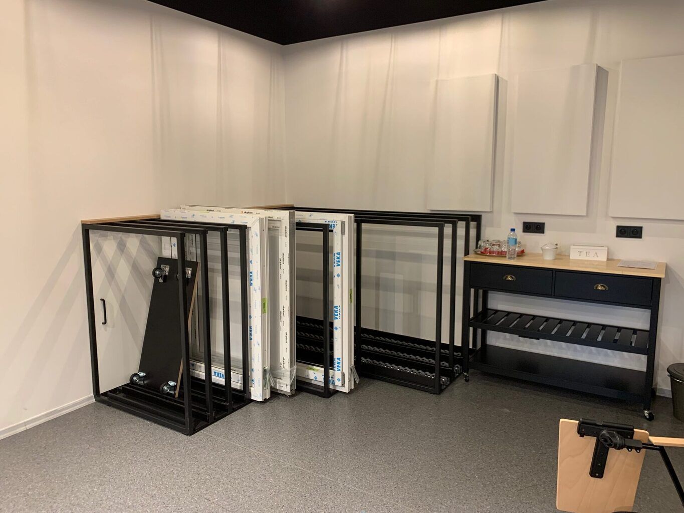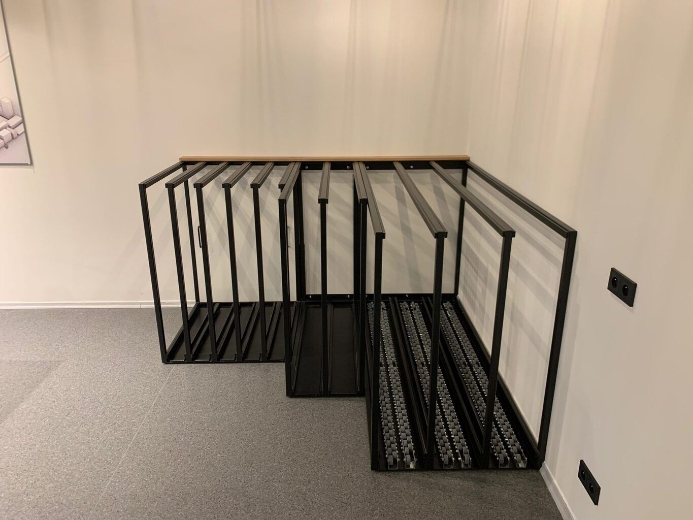 Podstawą ekspozytora jest konstrukcja zbudowana z precyzyjnie połączonych kształtowników stalowych, skręcanych śrubami. Taka budowa gwarantuje nie tylko stabilność, ale również elastyczność, umożliwiając dostosowanie ekspozytora do różnorodnych prezentowanych okien i okuć. Trójkątna forma konstrukcji dodatkowo wzmacnia stabilność.