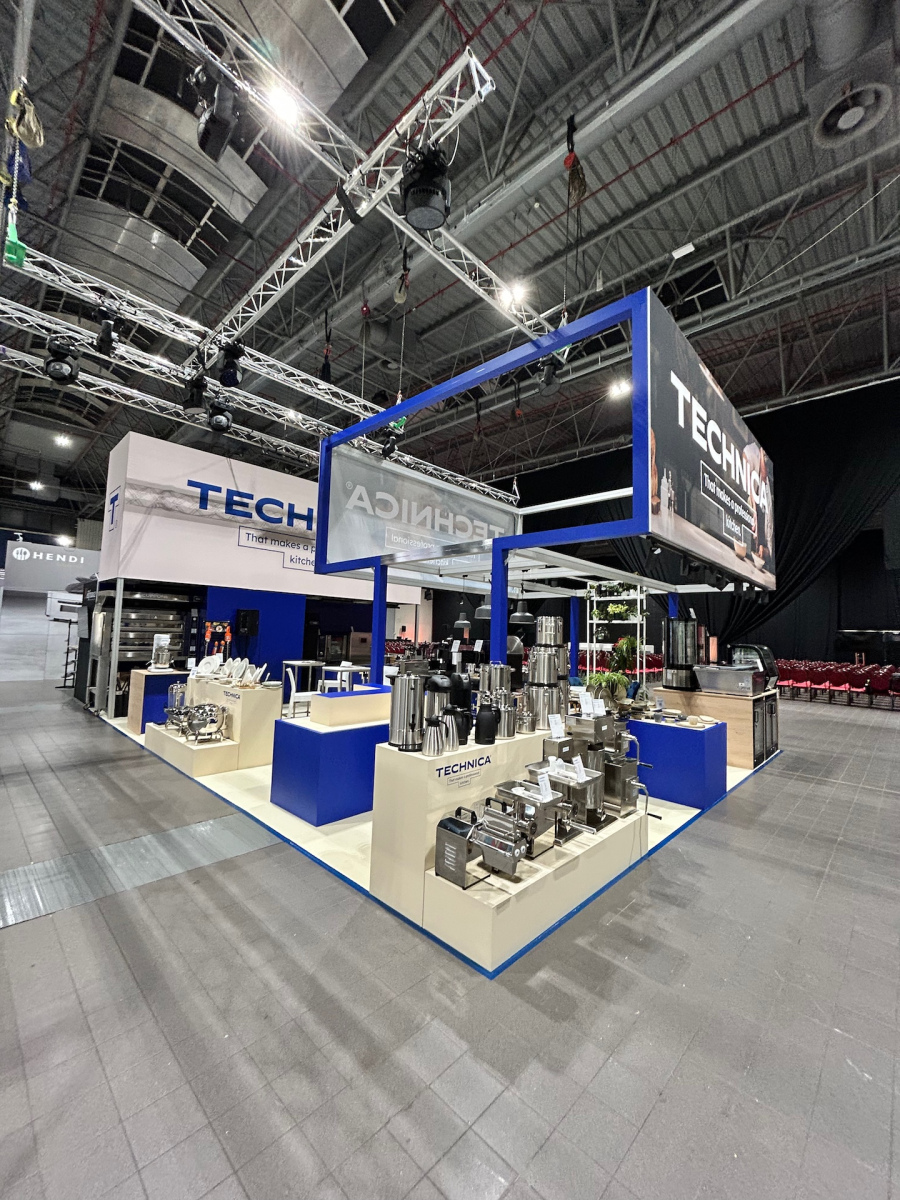 Stoisko targowe firmy TECHNICA prezentuje różne duże urządzenia kuchenne i przemysłowe ze stali nierdzewnej na niebieskich platformach, pod zawieszonym oznakowaniem. Hala wystawowa ma wysoki, przemysłowy sufit z reflektorami i widocznymi metalowymi belkami. projekt i nadzór Tatjana Kobuszewska trksystem.com