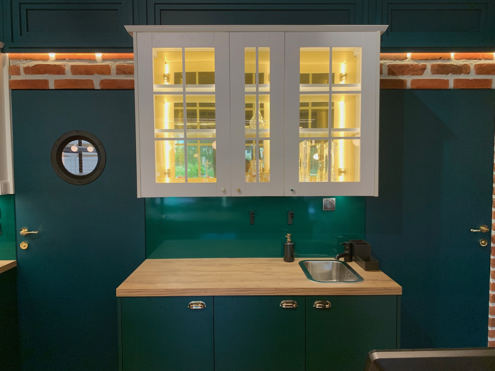 Tatjana Kobuszewska stoi przed stoiskiem targowym La Pavoni / Smeg z ekspresami do kawy i urządzeniami kuchennymi na drewnianych ladach – świetny przykład dobrze dobranego oświetlenia. projekt i nadzór Tatjana Kobuszewska trksystem.com
