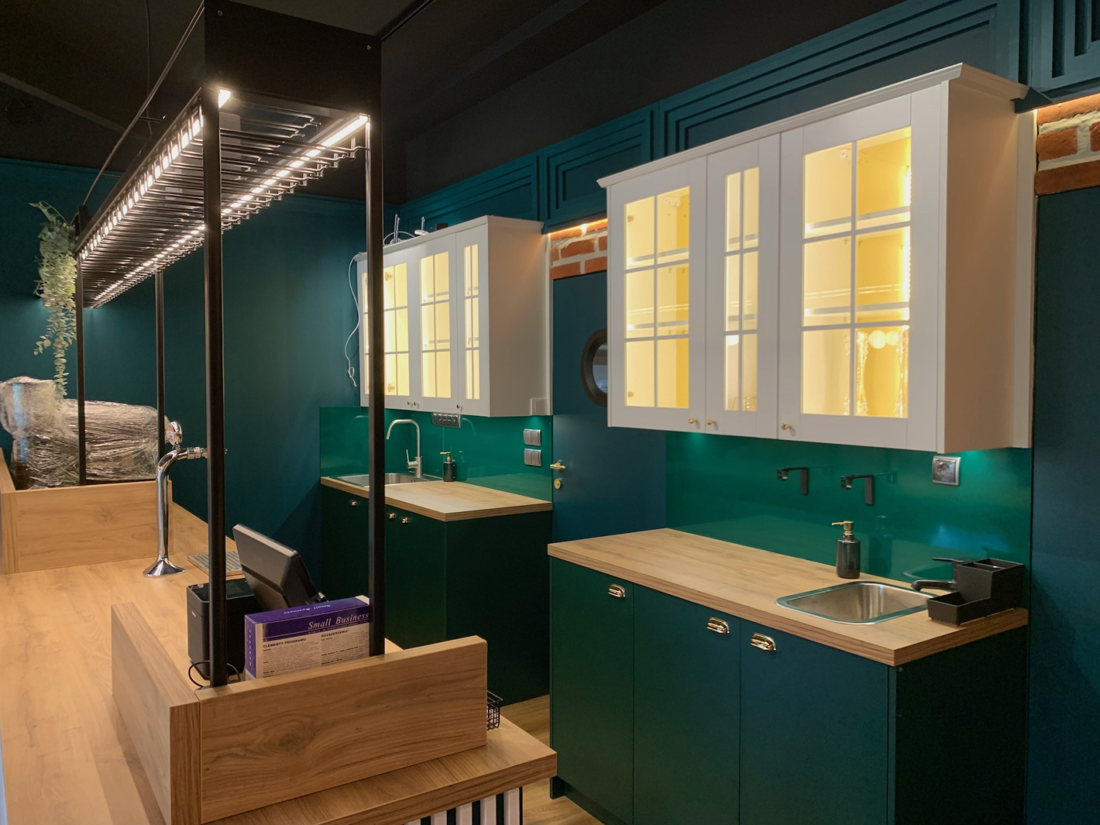 Tatjana Kobuszewska stoi przed stoiskiem targowym La Pavoni firmy Smeg z ekspresami do kawy, roślinami i urządzeniami kuchennymi na drewnianych ladach - świetny przykład dobrze dobranego oświetlenia. projekt i nadzór Tatjana Kobuszewska trksystem.com