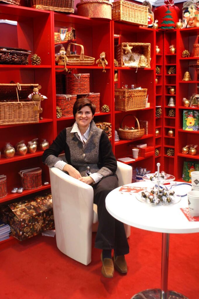 Tatjana Kobuszewska stoi przed stoiskiem targowym La Pavoni / Smeg z ekspresami do kawy i urządzeniami kuchennymi na drewnianych ladach – świetny przykład dobrze dobranego oświetlenia. projekt i nadzór Tatjana Kobuszewska trksystem.com