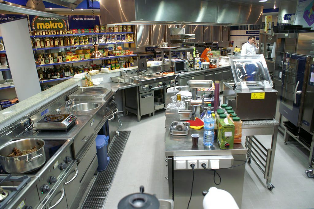 Makro Centrum HoReCa. Kuchnia wzorcowa. Widok z góry w pełni wyposażona profesjonalna kuchnia. Kuchnie stoły chłodnicze i piece konwekcyjno-parowe.Nad stanowiskami zawieszone różne rodzaje okapów. Wzdłuż kuchni i stołów wbudowane odwodnienia liniowe. Na drugim planie regały zapełnione cząstką oferty Makro. Projekt i nadzór Tatjana Kobuszewska Na zdjęciu kucharz Robert Ciechomski HoReCa Center close-up. Model kitchen. Top view fully equipped professional kitchen. Kitchens, cooling tables and combi steamers. Various types of hoods are hung over the workstations. Built-in linear drains along the kitchen and tables. In the background, shelves filled with a part of the Makro offer. Design and supervision by Tatjana Kobuszewska In the photo: cook Robert Ciechomski who is not only a chef, but also turned out to be a TV personality. Makro filmed episodes with model cooking demonstrations, and Robert showed off his acting talent there.